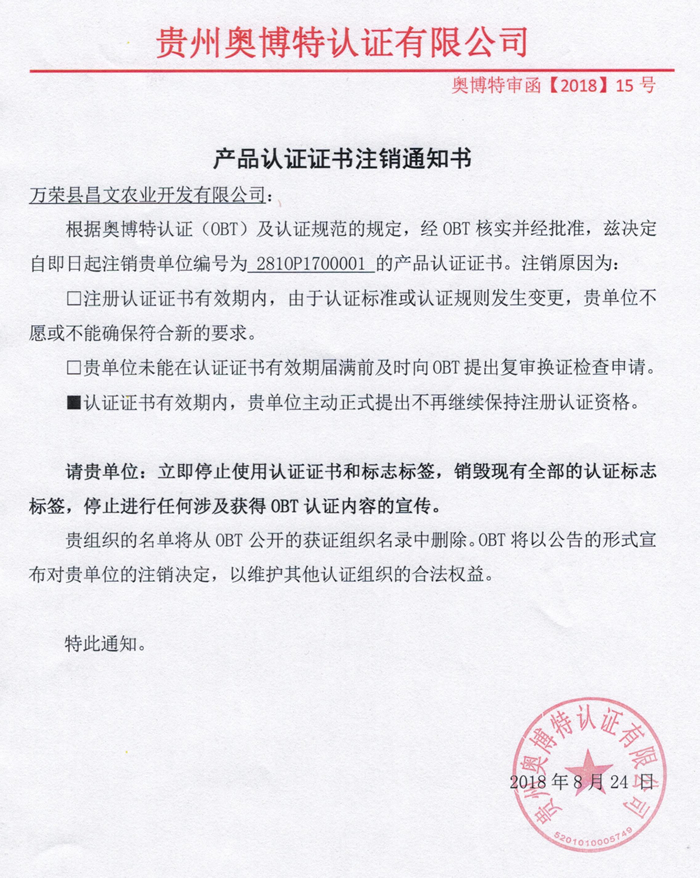 注銷萬榮縣昌文農業開發有限公司產品認證證書通知