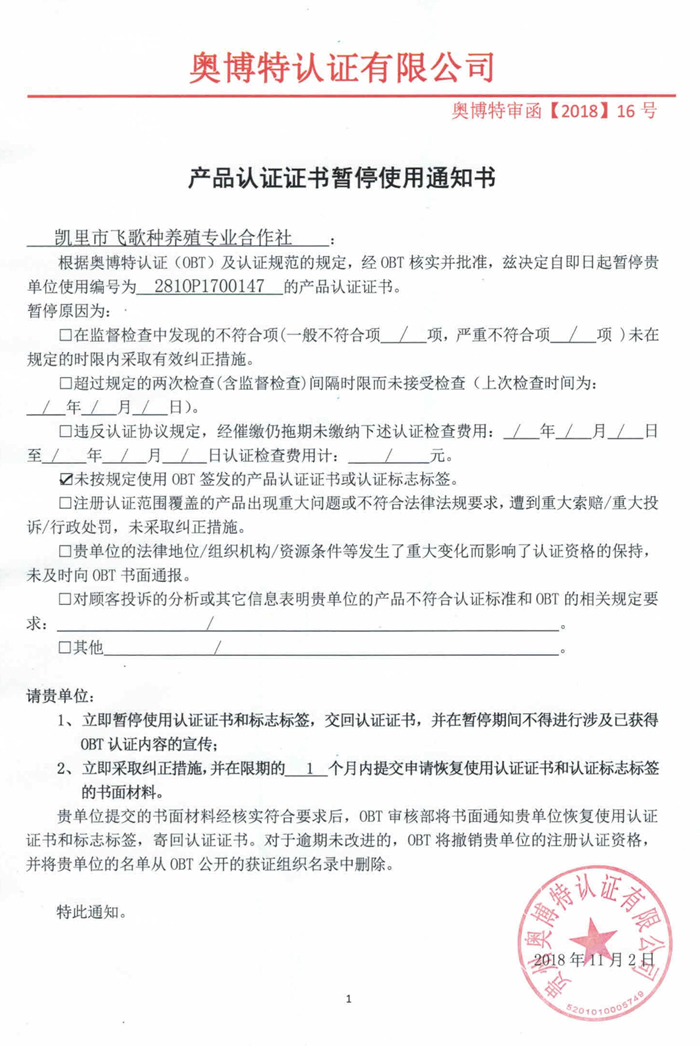 暫停凱里市飛歌種養殖專業合作社產品認證證書使用通知書