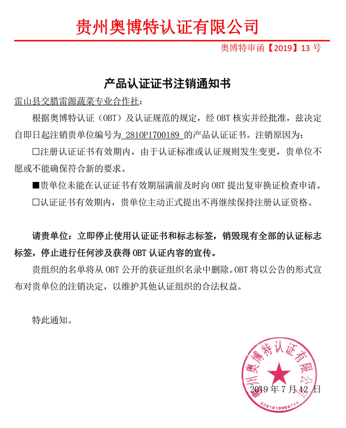 注銷雷山縣交臘雷源蔬菜專業(yè)合作社產(chǎn)品認(rèn)證證書通知