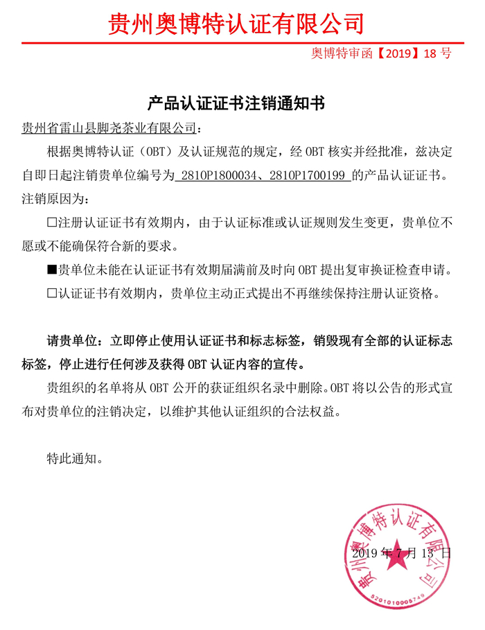 注銷貴州省雷山縣腳堯茶業(yè)有限公司產(chǎn)品認(rèn)證證書通知