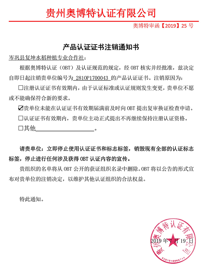 注銷岑鞏縣復坤水稻種植專業(yè)合作社產(chǎn)品認證證書通知