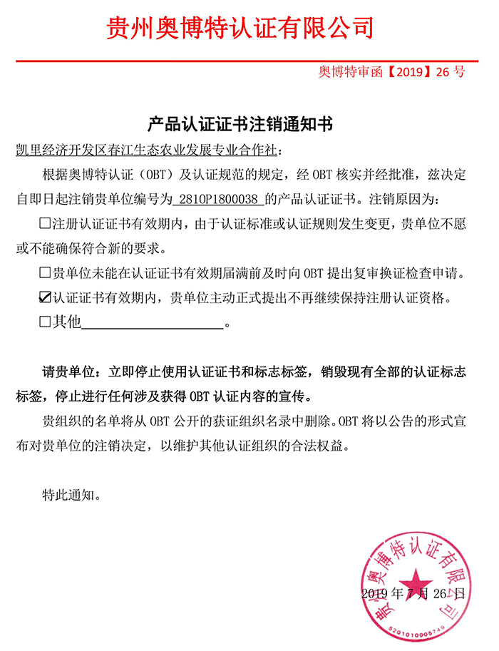注銷凱里經(jīng)濟(jì)開發(fā)區(qū)春江生態(tài)農(nóng)業(yè)發(fā)展專業(yè)合作社產(chǎn)品認(rèn)證證書通知