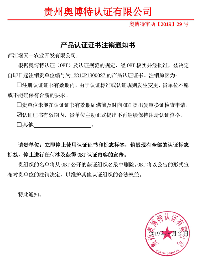 注銷都江堰天一農業開發有限公司產品認證證書通知