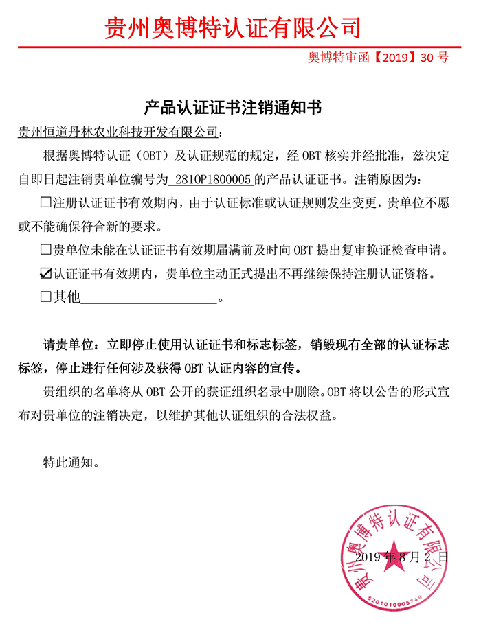 注銷貴州恒道丹林農業科技開發有限公司產品認證證書通知