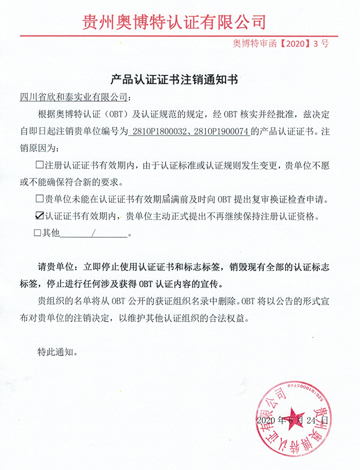注銷四川省欣和泰實業(yè)有限公司產(chǎn)品認(rèn)證證書通知